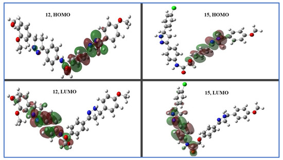 Frontier molecular orbital (FMO) studies can help us to understand the nature of intramolecular charge separation, electronic excitation, and electron density transition in a molecule [57]. The analysis of EHOMO and ELUMO molecular orbitals, which stand for the highest occupied and lowest unoccupied molecular orbital energies, respectively, is related to the chemical reactivity and stability. Compounds 12 and 15 have HOMO spatial distributions that are primarily distributed on their pyrazoline ring (A) and phenolate moieties (the electron transfer zones), while their LUMO spatial distributions are located on the other pyrazoline ring (B) and aniline moieties (the electron acceptor zones); see Figure 9.