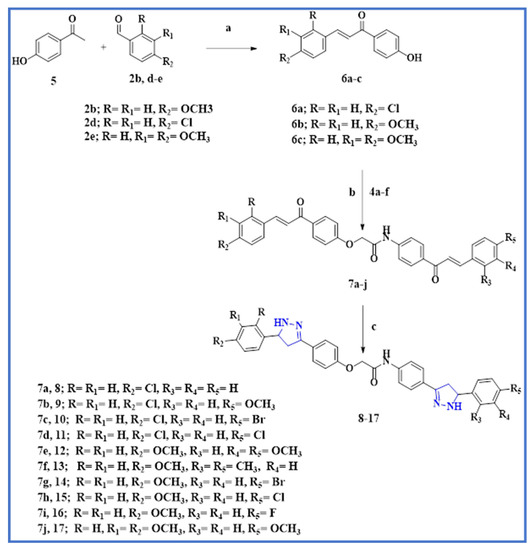 4-hydroxy chalcones 6a–c were synthesized using the Claisen–Schmidt reaction from aromatic substituted aldehydes 2b, 2d, and 2e. As shown in Scheme 2, the 4-hydroxy-acetophenone 5 reacts with aldehydes 2b, 2d, and 2e to produce 4-hydroxy-chalcone 6a–c. The bis chalcones 7a–j were synthesized via SN2 alkylation. The formation of 4-phenoxy potassium salt from phenolic chalcones 6a–c occurred by reacting them with anhydrous potassium carbonate, which was then alkylated with chalcones 4a–f in refluxing acetone to afford 7a–j in a high yield; see Scheme 2. Finally, these bis chalcones 7a–j were treated with an excess equivalent of hydrazine hydrate to yield novel target bis-pyrazoline hybrids 8–17.