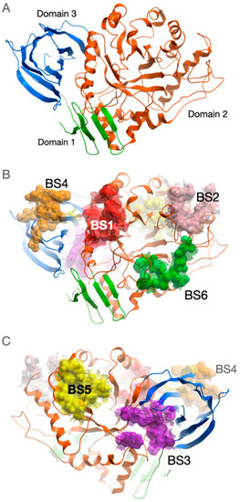 Spatial structure of GCase with potential binding sites mapped on its surface. (A) GCase comprises three domains marked by different colors: green—Domain 1, orange—Domain 2, blue—Domain 3. Amino acid residues combined into potential binding sites (BS) are displayed by van der Waals spheres: (B) view from the side of GCase where the active site is located (red—BS1, pink—BS2, green—BS6, orange—BS4), (C) view from the opposite side of protein (violet—BS3, orange—BS4, yellow—BS5). The model of the mutant form of the enzyme was constructed by introducing the amino acid substitution N370S into the structure deposited in 2NT1 PDB entry (subunit A) followed by relaxation using molecular dynamics simulations in explicit water.