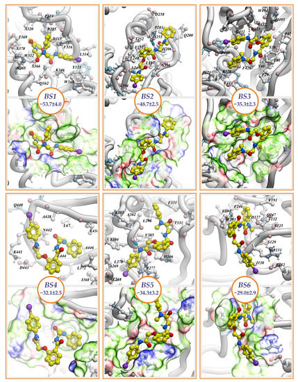 Compound NCGC607 forms the most stable complex with GCase when it binds at the BS1 site. Here, two poses of the compound have the minimal values of binding free energies: BS1.1 (−53.7 ± 4.0 kcal/mol) (Figure 2, BS1) and BS1.2 (−50.2 ± 3.1 kcal/mol) (Supplementary Figure S1). In BS1.1 pose, NCGC607 has U-shape conformation where N-methylaniline group takes up position perpendicular to the plane in which the rest of the molecule lies. Its benzamide group penetrates to the cavity appeared on the GCase surface in a result of N370S amino acid substitution. N-methylaniline group interacts with Loop 6. This pose can be stabilized by 5 hydrogen bonds between: N atom of 4-iodoaniline group and Oδ Asp315, N atom of benzamide group and Oγ Ser366, O atom of oxoethyl group and Nε Gln362, O atom of oxoethoxy group and Nε Gln362, O atom of oxoethoxy group and Nζ Lys346. Nevertheless, exposed to the solvent N-methylaniline group displayed high mobility during MD simulations, but its position can be stabilized by flexible hydrophobic residue Phe316, the interaction with which significantly (about 8 kcal/mol) decreases the binding free energy of the compound. On the other hand, along MD trajectory NCGC607 stably keeps BS1.2 pose in binding site. In this pose N-methylaniline group is buried into the cavity close to S370 residue and 4-iodoaniline group is buried into a cavity enclosed by Loops 6 and 7 and alpha-helix 7, benzamide group interacts with Loop 6. The compound can form hydrogen bonds by N atoms of benzamide and 4-iodoaniline groups with O atom of F316.