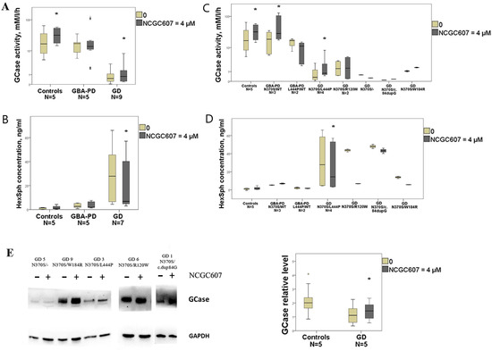 Evaluation of the NCGC607 effect (4 µM, 4 days) on GCase activity and protein levels, HexSph concentration in cultured macrophages from GD, GBA-PD patients and controls. (A) GCase activity (log scale) and (B) HexSph concentration in cultured macrophages from GD, GBA-PD patients and controls. (C) GCase activity (log scale) and (D) HexSph concentration in GD and GBA-PD macrophages depending on the type of GBA1 mutations. (E) Western blot analysis of GCase levels in GD macrophages. * p-value < 0.05 compared to untreated cells.
