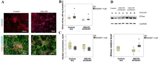 Evaluation of the NCGC607 effect (4 µM, 21 days) on GCase activity and protein levels, HexSph concentration in iPSC-derived DA neurons from GBA-PD patient (N370S/WT) and controls. (A) Immunofluorescent staining of DA neurons for neuronal markers. (B) GCase activity and (C) HexSph concentration in DA neurons from patient with GBA-PD (N370S/WT) and controls. (D) Western blot analysis of GCase levels in GBA-PD DA neurons. * p-value < 0.05 compared to untreated cells.