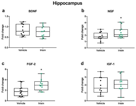 We also studied FGF-2, another neurotrophic factor able to regulate neurogenesis, synaptic formation, and growth [33]. FGF-2 has been implicated in stress-related mood disorders, such as depression, and its expression is reduced in the hippocampus of MDD patients [48,49,50,51]. In this work, we observed a significant increase in the mRNA levels of FGF-2 in irisin-treated mice in the hippocampus and the PFC, suggesting that, unlike the above-discussed neurotrophins, Fgf-2 did not display a cerebral site-specific increase. Of note, other studies reported the upregulation of Fgf-2 expression after antidepressant treatments [52,53]. For example, Maragnoli et al. observed higher levels of FGF-2 mRNA in the PFC of rats submitted to short- and long-term treatment with a combination of antidepressant drugs [52].