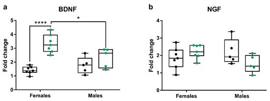 Gene expression of Bdnf (a) and Ngf (b) in the PFC of male and female mice injected with irisin for short-term. The Shapiro–Wilk test was followed by two-way ANOVA analysis and Tukey’s multiple comparison test; * p < 0.05; **** p < 0.0001. Data are presented as box-and-whisker plots with median and interquartile ranges, from max to min, with all data points shown. Black dots indicated vehicle-treated mice; green dots indicated irisin-treated mice.