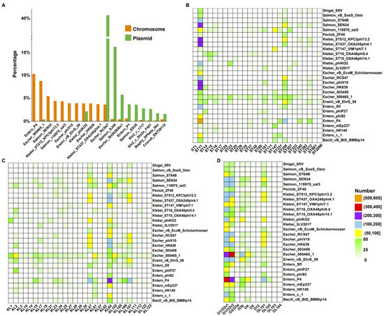 Comparison of prophages on chromosomes and plasmids and the relationship between strain types and types of prophages integrated with chromosomes. (A) Prophage types on chromosomes and plasmids and their respective proportions (top 10 for each). Horizontal coordinate, prophage type. Vertical coordinate, percentage. The vertical axis is truncated at 18–38. Orange, chromosome. Green, plasmid. (B) The relationship between sequence types and prophage types of chromosome integration. (C) The relationship between the type of K locus and the prophage types of chromosome integration. (D) The relationship between the types of LPS serotype (O locus) and the prophage types of chromosome integration. Sequence types, K-locus types, and O-locus types are shown along the X-axis, and prophage types are shown along the Y-axis. The color in the box indicates the number of prophages.