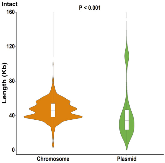 To understand whether there are differences in the size of prophages located on chromosomes and plasmids, all prophages were classified and compared according to their position in the genome of the strain and their degree of completeness. Intact prophages were our first focus, as they were most likely to be structurally and functionally intact. The results showed that the length of intact prophages found in chromosome sequences was significantly longer than that of prophages on plasmids (Mann–Whitney, p < 0.001, Figure 4, Table S5). Furthermore, prophages of questionable and incomplete types on chromosomes also had larger genomes than prophages of the same type on plasmids (Mann–Whitney, p < 0.001, p = 0.885, respectively, Figure S2A,B, Table S5). Our results suggested that prophages may be selective for different genetic regions in the genome of the strain, in addition to selecting specific integration sites [8,9] during their entry into the genome of the host bacterium.