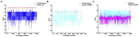 Comparison of the GC content of the prophage and the chromosome or plasmid on which it was located. (A) GC content of prophage Entero_P4 with its host chromosome. (B) GC content of prophage Escher_RCS47 with its host chromosome. (C) GC content of prophage Escher_RCS47 with its host plasmid. The X-axis indicates the number of prophages, and the Y-axis indicates the GC content of chromosomes, plasmids, or prophages. Red line, chromosome. Pink line, plasmid. Blue line, prophage Entero_P4. Cyan line, prophage Escher_RCS47.