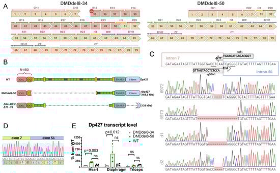 2.1. Exons 8 to 50 of the DMD Gene Are Deleted Using the CRISPR-Cas9 Genome Editing Technique