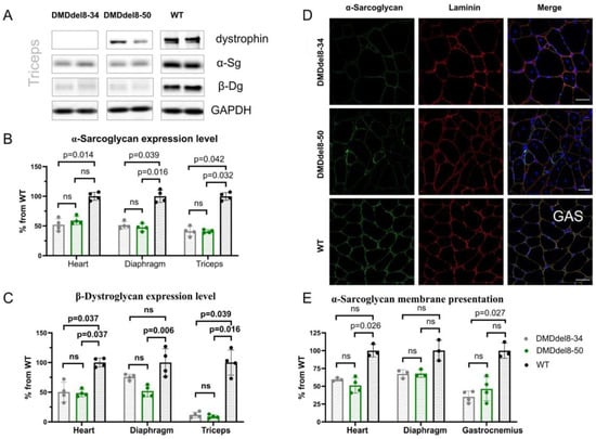 DAGC is not restored by truncated dystrophin expression. (A) Western blotting of DAGC components’ expression in the triceps. Loading control: GAPDH. (B) Quantitative analysis of Western blots for α-sarcoglycan expression in the heart, diaphragm, and triceps. See also S6A, left panel. (C) Quantitative analysis of Western blots for β-dystroglycan expression in the heart, diaphragm, and triceps. See also S6A, right panel. (D) Immunofluorescence analysis of gastrocnemius muscle sections with antibodies to α-sarcoglycan. Scale bar = 50 μm. (E) The intensity of α-sarcoglycan immunofluorescence staining on the sarcolemma. See also Figures S5 and S6B. A Kruskal–Wallis test with Dunn’s test for multiple comparisons was applied. Data presented as mean ± SD. N = 3–4 animals per group. p-values are shown on the graphs; ns—non-significant.