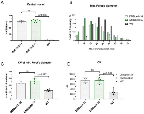 Skeletal muscles that lack dystrophin are more vulnerable to contraction-induced injury. Membrane damage causes muscle fiber necrosis and inflammation. Connective and adipose tissues replace necrotic muscle fibers. Myofibers mature from satellite cells and partially fill the necrotic areas during the regeneration process. They have nuclei that are positioned in the center and a smaller diameter. The percentage of myofibers with central nucleation is frequently used to track the progression of muscular dystrophy. Skeletal muscle histological changes in patients with BMD are extremely variable. More severely affected muscles may resemble DMD tissues, whereas pathology in less severely affected muscles may be limited to fiber size variation and mild fibrosis []. In the gastrocnemius muscle of 10-week-old DMDdel8-50 mice, we found an average of 63% of centrally nucleated myofibers, which is comparable to age-matched DMDdel8-34 mice muscles, but much higher than the content of normal muscles, which was just a small percentage (Figure 4A and Figure 3D, merge; Figure S7). Affected muscles typically contain large myofibers in addition to small ones, which raises the coefficient of variation of the myofibers’ diameter. In comparison to wild-type animals, we observed a leftward shift in the minimal Feret’s diameter and an increase in CV in DMDdel8-50 gastrocnemius muscle sections (Figure 4B and Figure S7). Little fibers (0–5 and 5–10 km intervals) were more common in DMDdel8-50 gastrocnemius sections than in wild-type animals or even DMDdel8-34 KO mice. Muscle enzymes are released into the blood when the integrity of muscle fibers is compromised, and, therefore, the level of creatine kinase in blood serum serves as an indicator for the progression of muscular dystrophy. We found elevated CK levels in DMDdel8-50 animals which were identical to those in KO mice (Figure 4E). Hence, in DMDdel8-50 mice, shortened dystrophin is unable to protect the skeletal muscle fibers from damage caused by contraction and the accompanying histological alterations.