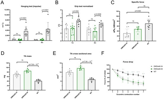 In juvenile and adult mice with exon 8–50 deletion, skeletal muscle function is compromised. (A) Maximal suspension time in hanging wire test of mice at 1 month and 4 months of age. (B) Grip force normalized to body weight. (C) Force generated by isolated TA muscle normalized on cross-sectional area. (D). TA muscle mass. (E) TA muscle cross-sectional area. (F) Reduction in TA muscle force generated in seven consequent eccentric contractions. An ordinary one-way ANOVA with Dunnett’s test for multiple comparisons was used for (A,B,E,F). A Kruskal–Wallis test with Dunn’s test for multiple comparisons was applied for (C–E). Data presented as mean ± SD (A–E) and mean ± SEM (F). N = 7–9 mice (A,B), N = 6–8 TA muscles (C–F). p-values are indicated on the graphs or marked * p < 0.05, ** p < 0.01; ns—non-significant.