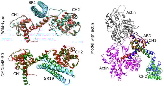 The functional properties of the resulting dystrophin may be affected by the domain composition and interactions. The connection of CH2 to the rod via the hinge corresponds to natural protein structure (Figure 1B). Nevertheless, shortened dystrophin was nonfunctional when exons 8–50 were deleted. This may highlight the significance of missing residues in the interdomain interaction. The obtained version lacks the 22 AA residues from CH2 encoded by exon 8 and the 10 AA residues from H3 encoded by exon 50. The three-dimensional structure and formation of binding sites in N-ABD can be affected by the deletion of terminal 22AA in CH2. This is indirectly corroborated by a meta-analysis of patient data revealing that exon 8 absence at the start or end of an in-frame deletion (exon skip-equivalent mutations) was not linked with a lower incidence of DMD compared to corresponding exon skip-amenable mutations []. However, based on the results of in silico prediction, we did not uncover any essential spatial changes that could disrupt dystrophin–actin binding.