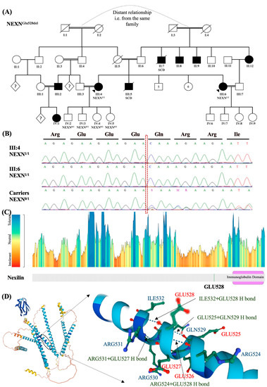 Clinical Genetic Testing: Untargeted screening for the disease-causing genetic variant(s) was done using a whole-exome sequencing assay for Patient-1 (III:6, Figure 1A,B). One homozygous variant was found to be a non-benign, rare (MAF < 1%) variant falling in inherited CM-causing genes. This variant is causing an in-frame deletion of 3 nucleotides in the NEXN gene ((NM_144573.4:c.1582_1584del(p.Glu528del)). This homozygous variant was also detected by exome and Sanger sequencing in the patient’s sister (Patient-2, III:4; Figure 1A,B), a confirmed case of DCM. This homozygous deletion was missing from our cohort of 343 in-house exomes, including the exomes of 33 patients with documented CM and their family members. It is also not listed in the homozygous state in gnomAD v2.1.1, spanning 125,748 exome sequences and 15,708 whole-genome sequences from unrelated individuals. The position is conserved (phyloP = 9.77, Gerp++ = conserved, CADD =22.5), and MetaDome predicts amino acid position 435 and onwards to be intolerant to changes (Figure 1C) [18]. GLU528 falls in a repetitive sequence of glutamic acid residues starting from 525 to 528 that form several hydrogen bonds with surrounding amino acids, possibly indicating a role in protein folding (Figure 1D). Other heterozygous pathogenic variants and variants of unknown significance falling within known inherited CM genes that might contribute to this phenotype are also shown in Table 1.