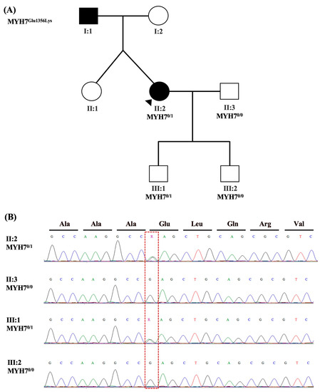 Clinical Genetic Testing: Whole-exome sequencing was performed for Patient-3, her husband, and two sons. A heterozygous pathogenic variant was detected in the MYH7 gene in the patient (II:2; Figure 1A) as well as one of her young asymptomatic sons (III:1; Figure 1A). In silico analysis supports that this missense variant has a deleterious effect on protein structure/function In silico analysis supports that this nonsynonymous variant in MYH7 (NM_000257.4:c.4066G>A (p.Glu1356Lys)) has a deleterious effect on protein structure/function according to ACMG classification criteria as shown in Table 1. This variant was confirmed in this family by Sanger sequencing (Figure 2B) and was not found in gnomAD or our in-house cohort of exomes.