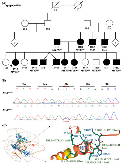 Clinical Genetic Testing: One of the patient’s brothers (IV:12; Figure 3A) and both parents (III:1, III:2; Figure 3A) underwent whole-genome sequencing in a certified clinical lab (Centogene, Cambridge, MA, USA). The only variant that was found to be the plausible cause of IV:12 DCM phenotype was a homozygous nonsynonymous substitution in MYPN gene ((NM_001256267.1):c.65C>G (p.Ala22Gly)) (Table 1). The variant was co-segregated with the DCM (Figure 1A,B). Both parents carried the heterozygous form of this variant. Target Sanger sequencing of available family members revealed that Patient-4 (IV:2) and some of her other siblings were carriers of the heterozygous variant (IV:4, IV:7, IV:8) (Figure 1A,B). This variant is rare (MAF = 0.000167) and was predicted to be pathogenic by nine computational predictions tools, including DANN, EIGEN, FATHMM-MKL, LIST-S2, M-CAP, MVP, MutationAssessor, MutationTaster, and SIFT VS. Two benign predictions from BayesDel_addAF and PrimateAI were reported. Ala22 forms multiple hydrogen bonds with other amino acids within the MYPN protein that could be disrupted by its deletion (Figure 3C).