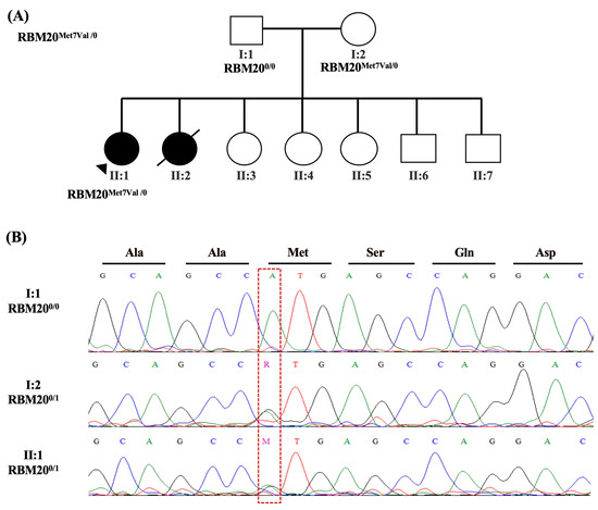 Patient-5 family pedigree and genetic analysis results. Family pedigree showing the family history of Patient-5 (II:1) and sequencing results in available family members for a rare heterozygous variant in RBM20 (NM_001134363.3):c.19A>G (p.Met7Val) (A). Circles indicate female family members; squares, male family members; filled symbols, presence of the cardiomyopathy phenotype; open symbols, asymptomatic family members; arrows, the proband; symbols with a slash mark, those who have died; 0/1 indicates heterozygosity; 1/1 indicates homozygosity. Sanger sequencing representative chromatograms show that the nonsynonymous variant c.19A>G alters ATG (Met) at that position to GTG (Val). This substitution was transmitted to the proband from her mother (I:2) while the father carried the wild-type genotype (I:1) (B). The corresponding encoded amino acid is shown above the chromatograms, and the mutated nucleotide is enclosed in a red dashed box. Met, Methionine, Val, Valine; Ala, Alanine; Ser, Serine; Gln, Glutamine; Arg, Arginine; Asp, Aspartate.