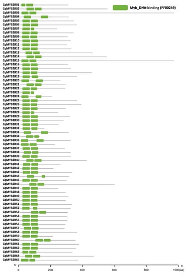 MYB transcription factors (TFs) can be divided into four classes based on the number of adjacent repeats (one, two, three, or four). In this study, we screened 204 MYB proteins according to the Hidden Markov Model (HMM) profile (PF00249) [,] in quinoa (Chenopodium quinoa Willd.). From them, we identified 65 R2R3-MYB proteins depending on the adjacent repeating sequences and named them as CqMYB2R1-CqMYB2R65 according to the Gene IDs. The CqR2R3-MYB proteins harbor two adjacent repetitive MYB_DNA binding domains (R) at N-terminus (Figure 1). Their basic information of CqR2R3-MYB TFs is summarized in Table 1. The average protein length is 336 amino acid (aa) residues, the average molecular weight is 37.8 kDa, and most CqR2R3-MYBs belong to acidic proteins with pI < 7. Prediction of subcellular localization indicates that most CqR2R3-MYB proteins are localized in the nucleus, except for CqMYB2R35, with a dual-localization of nucleus and cytoplasm.