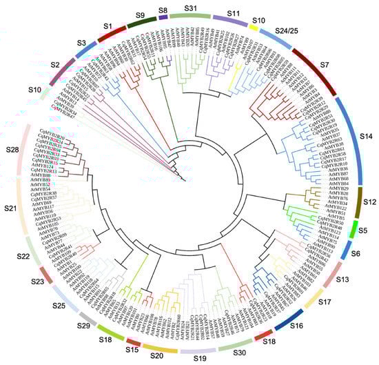 To assess the evolutionary relationship of R2R3-MYB TFs in Chenopodium quinoa Willd. and Arabidopsis thaliana (L.), the phylogenetic tree of R2R3-MYB families was constructed using protein sequences of AtR2R3-MYBs [] and CqR2R3-MYBs. Based on the phylogenetic tree, the AtR2R3-MYB and CqR2R3-MYB family members were divided into 31 subfamilies (Figure 2). CqR2R3-MYB proteins are found in 26 subfamilies, except for S6, S8, S10, S12, and S15 subfamilies, which only contain AtR2R3-MYBs.