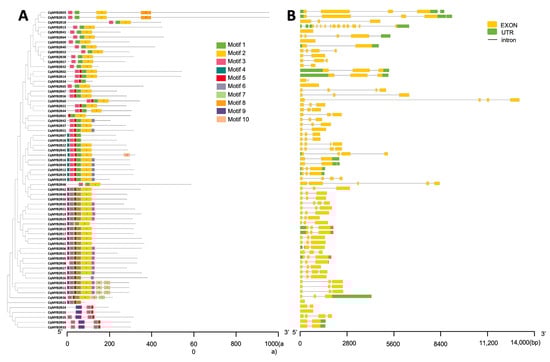 Analysis of conservative motifs and gene structure of CqR2R3-MYB family members. (A) Conservative motif analysis of CqR2R3-MYB proteins. Different colors represent different motifs. (B) Gene structure of CqR2R3-MYBs. UTR, untranslated region.