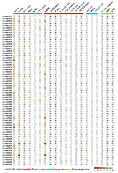 The sequences of 2000 bp upstream of the start codon (ATG) were selected as CqR2R3-MYB promoters for cis-regulatory elements analysis. A total of 20 elements were identified in the promoter by PlantCARE software and the score of each element in each promoter is displayed digitally (Figure 4) []. The cis-acting elements are classified into four categories, including light response, plant hormone, plant growth, and stress response. The plant hormone group contains the most elements which are involved in the abscisic acid responsiveness (ABRE), gibberellin-responsive element (GARE-motif, P-box), salicylic acid responsiveness (TCA-element), auxin-responsive element (TGA-element), gibberellin-responsive (TATC-box), and MeJA-responsiveness (CGTCA-motif, TGACG-motif), suggesting that the CqR2R3-MYB genes are regulated by multiple hormones, similar to R2R3-MYB genes in many other plant species. These results indicate that CqR2R3-MYB genes are widely involved in various physiological and biochemical activities in plants, and responses to environmental stimuli and stress.