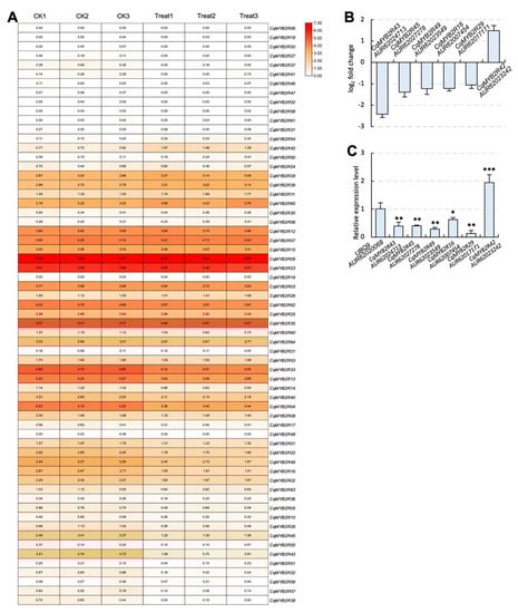 The expression pattern of CqR2R3-MYB genes. (A) The expression levels of all CqR2R3-MYB genes in quinoa leaves that had undergone saline–alkali stress. CK1, CK2, and CK3 are the three replicates of the CK group. Treat1, Treat2, and Treat3 are the three replicates of the carbonate-treatment group. (B) The log2 fold change of the six CqR2R3-MYB genes with the greatest changes in expression levels. (C) RT-qPCR validation of the CqR2R3-MYB genes in (B). UBQ9 (AUR62020068) was used as an endogenous control. Three independent experiments per sample, three replicates per experiment. *, p < 0.05; **, p < 0.01; ***, p < 0.001; Student’s t-test.