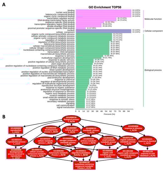 GO enrichment analysis of CqR2R3-MYB genes in quinoa leaves that had undergone saline–alkali stress. (A) Go enrichment analysis of TOP50 of CqR2R2-MYB genes. (B) The enriched GO terms in Biology Process of the differentially expressed CqR2R2-MYBs. Rectangles indicate the most significant terms. Rectangle and oval colors represent the relative significances, dark red indicates the most significant, p < 0.0001.