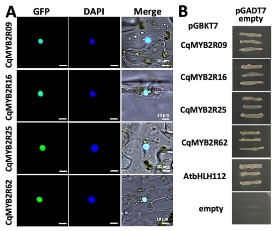 The subcellular location of CqR2R3-MYB TFs is related to their roles in the transcriptional regulatory network. Therefore, to validate their subcellular localization, we selected four CqR2R3-MYBs: CqMYB2R09, CqMYB2R16, CqMYB2R25, and CqMYB2R62, whose Arabidopsis homologous are related to salt stress response [,,,] (Supplementary Figure S2). Since the nucleus localization signals (NLSs) are in the middle of these TFs, we cloned the constructs with GFP fused to N-terminal of CqR2R3-MYBs. The transient assay analysis indicated that all the four GFP-CqR2R3-MYB fusion proteins exhibited nucleus localization which was identical to the prediction (Figure 7A). Then, we investigated the autoactivation activity of these four CqR2R3-MYBs. The recombinant plasmids, pGBKT7-CqMYB2R09, pGBKT7-CqMYB2R16, pGBKT7-CqMYB2R25, and pGBKT7-CqMYB2R62, were transformed into yeast strain AH109 with pGADT7 vector, respectively. The transformants grew on SD/-Leu-Trp-His-Ade medium (Figure 7B), indicating that the four CqR2R3-MYBs have transcriptional activation activity. The above results indicate that CqR2R3-MYBs, CqMYB2R09, CqMYB2R16, CqMYB2R25, and CqMYB2R62 have the characteristics of TFs.