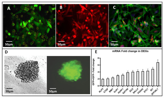 The triple negative BC cell line MDA-MB-231 was co-transfected with an exogenous GFP-tagged OCT3/4 promoter (phOCT4p-eGFP) and RFP-tagged CMV promoter (phCMV-mRFP). These cells were cultured in optimal growth conditions for the stable expression of Oct3/4, as described in the methods. The CMV-mRFP plasmid was utilized to determine the transfection efficiency, and we isolated stably transfected cells using GFP and RFP fluorescence as well as G418 antibiotic resistance. Three distinct populations, namely (GFP+RFP+), (GFP+RFP-) and (GFP-RFP+), could be visualized (Figure 1A–C) and were sorted using FACS. Using growth conditions specific for human embryonic stem cells (ESCs), as previously described [17,20], GFP+ and GFP− clones were cultured separately in a stem cell culture (SCC) medium. Single cells were assessed for their ability to maintain a stable expression of the Oct3/4-GFP reporter after replication in a 2D culture in normal growth media and in 3D mammospheres (mammary epithelial stem cell aggregates) cultured in SCC media. Two-dimensional cultures demonstrated a polyclonal phenotype with respect to the Oct3/4-GFP expression (Figure 1A–C, Supplementary Figure S1), while mammospheres cultured in the SCC medium demonstrated a stable expression of transfected Oct3/4 assessed by GFP fluorescence (Figure 1D), indicating a direct correlation with the Oct3/4 expression and stem cell phenotype of the transfected MDA-MB-231 cells. Several such clones assessed by flow cytometry revealed intra-clonal heterogeneity in the GFP expression (Supplementary Figure S1). A randomly selected clone (Clone#9, Supplementary Figure S1) with its (GFP+) and (GFP-) counterparts were selected using FACS for further in vitro genetic analysis and in vivo tumor growth studies. Using a qPCR and microarray analysis of the transfected MDA-MB-231 cells, FACS-purified (GFP+) cells were assessed for differentially expressed genes (expression change >2 log-fold, t-test p value < 0.01) when compared to (GFP- cells). We focused on several pioneer transcription factors and growth and developmental regulators of the Oct3/4 pathway that are involved in diverse cellular functions [21]. Developmental regulators, strongly associated with the early endo-mesodermal and neural cell-fate determination at gastrulation, such as Gata6, Sall4, Zic2, Bmi1, Klf5 and FoxA2, demonstrated a 2–4-fold upregulation. H2AfJ,a J-variant of the core H2A histone family and a group of genes involved in maintaining the cellular architecture, such as the actin cytoskeleton rearrangement required for EMT and MET transition (connexin-43/Gja1), as well as Id1, also demonstrated a significant modulation in expression. The early growth response regulator ZFP36L1 demonstrated the highest (8-fold) increase in mRNA expression (Figure 1E).