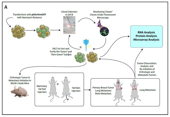 The metastatic potential of breast cancer significantly correlates with treatment failures, leading to increased morbidity and mortality, and is strongly mediated by CSCs [25]. Although causal mechanisms of PTFs such as Oct3/4 in cancer are complex and difficult to unravel, their differential expression in breast cancer compared to normal tissues is well established [26]. Several studies have revealed the role of Oct3/4-regulated PTFs in maintaining pluripotency, differentiation and EMT/MET plasticity in several types of cancers, including breast cancer [18,19]. In this study, we explored the association of a Oct3/4-related network of transcription factors, with the tumor initiation and metastatic potential of BCSCs. Additionally, we also assessed the tissue specific heterogeneity in the expression of this transcriptome, which may shed light on organ preferences for metastasis. For example: tumors in breast cancer have metastatic preference for bones, lungs, liver and brain [27]. We used the triple negative metastatic breast cancer cell line MDA-MB-231 transfected with an exogenous human Oct3/4-GFP promoter in a mouse tumor model. Two-dimensional cultures in a normal growth medium, both polyclonal and monoclonal, demonstrated a variable Oct3/4-GFP expression (Supplementary Figure S2). The heterogeneity of the cells in the culture with respect to the Oct3/4 activation could be modulated by growth conditions such as the addition of growth factors, anchorage dependence and serum withdrawal in the stem cell culture (SCC) media to induce and stably maintain the Oct3/4 expression. We have previously optimized the generation of brain tumor spheres with a sustained Oct3/4 expression in a glioma model and in osteosarcoma [17,20]. In this study, we were able to generate mammary epithelial stem cell aggregates (mammospheres) and verified the complete and stable expression of the Oct3/4 expression using GFP and flow cytometry (Figure 1A,B).