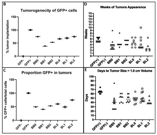 Using flow cytometry, we also measured the proportion of GFP+ cells in each round of re-implantation and observed a positive correlation between the total percentage of Oct3/4-activated tumor cells and efficiency of tumor implantation. We observed that the reduced tumor implantation efficiency during serial rounds of re-implantation in the breast (BB0 and BB1) correlated with less GFP+ cells in the tumor, and the increase in GFP+ cells in BB2, BL0 and BL2 corresponds with a higher tumor efficiency (Figure 2B,C). Although the aggressiveness in terms of tumor growth was not significantly different, a notable difference was observed in growth kinetics of BL2 and the corresponding percentage of GFP+ cells in the tumor (Figure 2D–E).