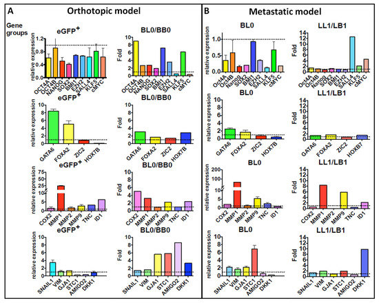 Assessing modulation of Oct3/4 network PFs and other TFs in our orthotopic and metastatic mouse model using Oct3/4-transfected MDA-MB-231 cells. MDA-MB-231 cells transfected with Oct3/4-GFP were used to generate tumors in nude mice in breast and lungs. Comparative qRT-PCR analyses of 25 differentially expressed genes of the Oct3/4 network is presented as relative expression to housekeeping gene (GAPDH) or fold change of GFP+ cells with respect to GFP- cells in (A) orthotopic model and (B) metastatic model. The dash line indicates a relative expression of 1 as a baseline for comparison in all the graphs. eGFP+: MDA-MB-231 GFP+ cells (baseline). BB0: Cells’ primary orthotopic breast tumor from the mammary fat pad. BL0: Lung mets from the primary breast tumor, BB0. LB1: Breast tumor generated from the serial implant (round 2) of the lung mets of BL0. LL1: Lung metastasis from LB1.