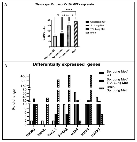 Heterogeneity of Oct 3/4 GFP expression and related transcriptome within primary tumors and metastatic lesions in different tissues. (A) Within tumors generated from Oct3/4-GFP-transfected MDA-MB-231 cells, proportion of Oct3/4 GFP+ cells is compared between primary tumor and metastatic lesions in different tissues. Subcutaneously implanted mammary fat pad tumor (orthotopic or OT) or lung metastasis from OT breast (sp. lung met) or lung metastasis from direct tail vain injection of cells (T.V. lung mets) or tumors formed by direct implantation in the brain (brain) were assessed for GFP+ cells using flow cytometry. Differences between the groups were analyzed using one-way ANOVA and post-Tukey multiple comparison test (data presented as mean ± S.D, n = 5, * p < 0.05, **** p < 0.0001, ns = not significant). (B) qRT-PCR analysis of differentially expressed genes of the OCT3/4 network in the GFP+ cells compared to GFP- cells within primary tumors and metastasis in different tissues. Fold changes with respect to the housekeeping genes presented as a ratio of spontaneous lung metastasis (sp. lung met), orthotopic (OT) and brain. Graph represents significantly (p < 0.001) upregulated genes from 3 independent cultures conducted in triplicate. (All other 36 genes assessed are included in Supplementary Figure S2).