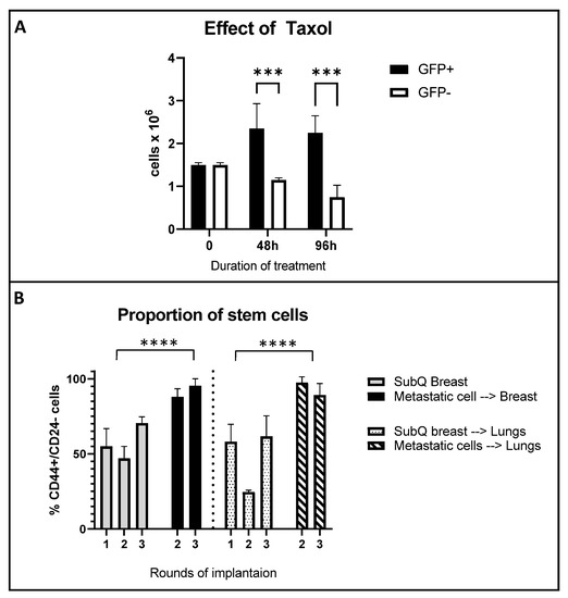 MDA-MB-231GFP+ and MDA-MB-231GFP- cells (see Materials and Methods, Section 4.2 and Section 4.3) were seeded in 100-mm dishes at a density of 1 × 106 cells/10 mL. The cells were treated with 10 nM of Paclitaxel. The cells were trypsinized at 24, 48 and 72 h and stained with trypan blue. The number of viable cells was counted using a hemocytometer. The dose selection and timing was selected from the literature [23].