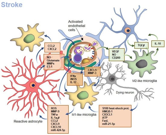 In the hyperacute phase, the sudden reduction in blood supply to the brain causes a depletion of glucose and oxygen that leads to a metabolic switch toward anaerobic glycolysis, with the production of lactic acid, a consequent pH decrease and a reduction in ATP. A lack of ATP drives the failure of ionic pumps, with an efflux of K+ and a reciprocal influx of Na+ that result in cell swelling, termed cytotoxic edema, and induce apoptosis. Injured neurons release key damage-associated molecular pattern (DAMP) molecules that include S100 heat-shock proteins [102], high-mobility group box-1 (HMGB-1) [103], ATP, uric acid, nucleic acids [104] and fractalkine (CX3CL1) [105], which are responsible for the initial activation and polarization of microglia following ischemia [106]. In particular, the expression of CX3CL1 by damaged neurons drives the expression of an “eat-me” signal recognized by microglial cells expressing complement 3a receptor (C3aR) that engulf dying but still viable neurons, exacerbating neuronal loss [107]. Moreover, it has been shown in vivo and in vitro that murine neurons release soluble FasL at 24 h and 72 h after a stroke, activating in microglia the JAK/STAT3 and NF-κB signaling pathways, thus inducing an (M1-like) pro-inflammatory phenotype [108]. Neurons and glia communicate also through extracellular vesicles (EVs), and, accordingly, it has been observed that exosomes derived from scratch-injured PC12 neurons contain miR-21-5p, which exacerbates in microglia the release of pro-inflammatory factors and promotes a neurotoxic phenotype [109].