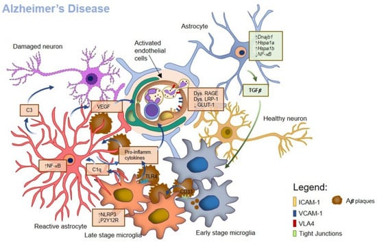 BBB properties are strongly affected by endothelial interaction with the other components of the NVU, in particular with glial cells (Figure 3). In AD, glial cells may both directly and indirectly participate in neuronal loss and in the setup of neuroinflammation, a condition that also influences BBB properties.