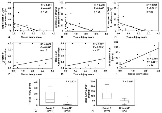 Correlations of expressions of membrane complement regulators (CRegs), CD46, CD55, and CD59, deposition of complement (C) activation products such as aC3 and C5b-9, and levels of sC5b-9 in peritoneal dialysis fluid (PDF) with tissue injury score and comparison of sC5-9 levels in PDF between Groups P and NP. Expressions of each of the CRegs CD46, CD55, and CD59 showed good inverse correlations with the severity score for peritoneal injuries ((A–C) respectively). In contrast, deposition of C activation products such as activated C3 (aC3) and C5b-9 correlated with the severity score of peritoneal tissue injures ((D,E) respectively). Adjusted PDF levels of sC5b-9 (sC5b-9/TP) also correlated with the severity score for peritoneal injures (F). Between Groups P and NP, the tissue injury score and PDF levels of sC5b-9/TP were significantly different ((G,H), respectively). Dots in the graph show outliers. Outliers were defined as values greater than the 75th percentile plus 1.5 times the interquartile range. #, p < 0.05.