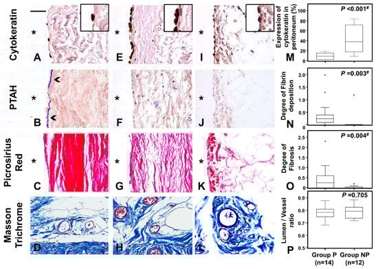 Fibrin exudation and fibrosis in the peritoneum between those with and without peritonitis. Frame sets (A,E,I), (B,F,J), (C,G,K), and (D,H,L) show the distributions of mesothelial cells stained by anti-cytokeratin, deposition of fibrin by phosphotungstic acid hematoxylin (PTAH) staining, distribution of fibrosis by picrosirius red staining, and vessels stained by Masson’s trichrome (MT), respectively. Frames (A–D) and (E–H) represent peritoneal tissues from patients with peritonitis (Group P) and patients without peritonitis (Group NP), respectively. As references, frames I–L showed control peritoneal tissues from a living renal transplantation donor (Control). Graphs (M–P) show results for proportions of mesothelial cells shown by anti-cytokeratin, scores of PTAH staining and picrosirius red staining, and lumen/vessel ratio reflecting the degree of vasculopathy under MT staining, respectively. Fibrin deposition (arrowhead) are shown in B. Original magnification of (A–L) is ×400. Right upper inserts in A and E show double the original magnification. A scale bar of 50 μm is shown in the left upper corner of frame A. * Peritoneal cavity side. Dots in the graph show outliers. Outliers were defined as values greater than the 75th percentile plus 1.5 times the interquartile range. #, p < 0.05.