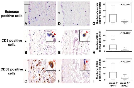 This figure shows the comparison of the accumulation of inflammatory cells in the peritoneum between those with peritonitis and those without. Frames and graphs show esterase-positive neutrophils (A,D,G), CD3-positive pan T-cells (B,E,H), and CD68-positive pan macrophages (C,F,I), respectively. Sets of photo frames (A–C) and (D–F) are peritoneal tissues of peritonitis in group P and of non-peritonitis in group NP, respectively. Accumulations of neutrophils, pan T-cells, and macrophages are observed in the peritoneum of group P significantly more than those of group NP. The original magnification of (A–F) was ×400 and a scale bar of 50 μm is shown in the left upper corner of frame A. * shows peritoneal cavity side. CD3/CD68—positive cells (arrowhead) are shown in right-upper corner of (B,C,E,F), which are magnified four times relative to the original photo. Dots in the graph show outliers. Outliers were defined as values greater than the 75th percentile plus 1.5 times the interquartile range. # p value < 0.05 is significance.