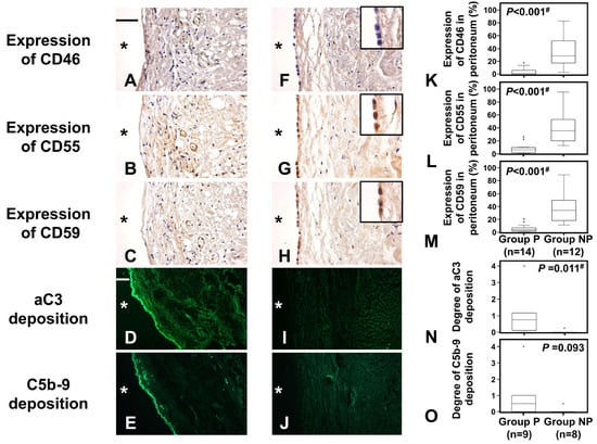 Expressions of CRegs CD46, CD55, and CD59 in those with and without peritonitis and depositions of complement (C) activation products. Frames (A–E) and (F–J) represent peritoneal tissues in Group P and Group NP, respectively. Frames (A,F), frames (B,G), frames (C,H), frames (D,I), and frames (E,J) show expressions of CD46, CD55, and CD59 and depositions of activated C3 (aC3) and C5b-9, respectively. Graphs (K–O) show results for expressions of CD46, CD55, and CD59 and deposition of aC3 and C5b-9, respectively. Original magnification of (A–C) and (F–H) is ×400, while that of (D,E,I,J) is ×100. Inserted frames in right upper corners of frames (F–H) are at double the original magnification. Scale bars of 50 μm and 200 μm are shown in the left upper corner of frames (A,D), respectively. * shows peritoneal cavity side. Dots in the graph show outliers. Outliers were defined as values greater than the 75th percentile plus 1.5 times the interquartile range. # p < 0.05.