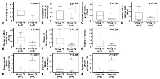 When expression of CRegs in the peritoneum was compared between Groups P1 and P2, expressions of CD46 and CD59 were significantly more decreased in Group P1 and expression of CD55 tended to be decreased, but not significantly, compared to Group P2 (Figure 5H–J).