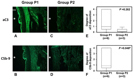 Deposition of C activation products aC3 and C5b-9 in fresh frozen tissues and in a typical biopsy tissue of peritoneum with peritonitis caused by fungus or P. aeruginosa (Group P1) and Gram-positive cocci (Group P2). Frame sets (A–D) show representative photos of deposition of aC3 and C5b-9 in peritoneum, respectively. Original magnification of (A–D) is ×100. A scale bar of 200 μm is shown in the left upper corner of frame A. Graphs (E,F) show degrees of aC3 and C5b-9 deposition, respectively. * Peritoneal cavity side. #, p < 0.05.