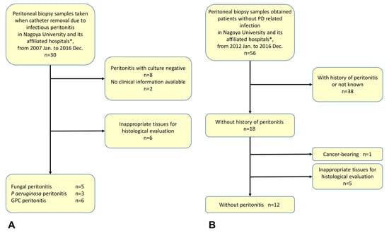 Analysis of peritoneal injuries in enrolled patients. Flow diagram (A) shows selection process to enroll patients with peritonitis (Group P). Flow diagram (B) shows selection process to enroll patients without peritonitis (Group NP). * Daiyukai Daiichi Hospital and Handa City Hospital; GPC, Gram-positive cocci; PD, peritoneal dialysis.