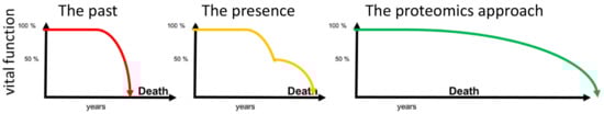 The promise of proteomics in the management of CKD patients. In the past (indicated in red), individuals died quickly from diseases, the transition from healthy to sick to death occurred fast. Current (indicated in yellow) patient care aims towards delaying death—but not preventing disease; treatment at late time point cannot stop or heal irreversible organ damage. Proteome analysis (indicated in green) enables early detection of cellular disease-specific changes, as the diseases are the results of proteome changes; the timely detection and early intervention allow prevention of the effects of diseases prior to irreversible organ damage.
