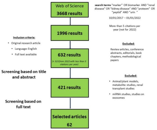 A review of the recent literature regarding the urinary biomarkers of CKD was performed, strictly following the PRISMA guidelines and using the Web of Science database (all databases). Manuscripts published from October 2017 until October 2022 were considered eligible for this review. Titles and topics were screened for the search terms “marker *” OR biomarker * AND “renal disease” OR “kidney disease” AND “proteome *” OR “peptid *” AND “urin *”. The search strategy is presented in Figure 2. The initial search resulted in 3669 hits with 1197 manuscripts cited more than 5 times per year. Review articles and conference abstracts were excluded. Publications from the year 2022 with less than 5 citations per year were manually selected according to their relevance to this review. Furthermore, articles based on animal models, metabolites, and kidney transplants were excluded. Additionally, studies focusing on micro-RNA and exosomal vesicles were excluded. This resulted in a total of 633 papers, which were examined by the authors. These publications and publications from the year 2022 with less than 5 citations per year were manually selected according to their relevance to this review. Finally, a total of 62 manuscripts, listed in the supplement (Table S1), served as a basis for this review.