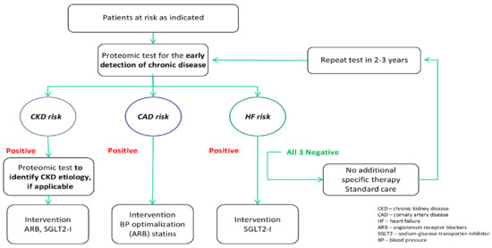 Urinary peptidomic and proteomic biomarkers hold the promise to significantly improve CKD management in the future. The next essential step is to move from discovery to application and demonstrate the value of urinary proteins and peptides in guiding interventions in the context of CKD, in order to make an impact on patient management. Since CKD is a risk factor for cardiovascular disease (CVD), the ultimate goal of biomarker development is to ensure a reduction in the progression of early towards established CKD and CVD and in preventing target organ damage. The analysis of the entirety of urinary peptides/proteins provides the possibility of distinguishing and studying multiple kidney pathologies via an analysis of only one urine sample [145]. A schematic depiction of a possible application of these urine peptide/protein biomarkers is shown in Figure 3. An early detection, as well as a more precise definition of the underlying etiology, will allow for appropriate and early intervention. Patients with high-risk profiles could be regularly tested using specific proteomic profiles tailored for the early detection of CKD, coronary artery disease (CAD), and heart failure (HF). Early-detection proteomic biomarkers could precede clinical diagnoses and thus ensure earlier interventions, as showcased in the scheme in Figure 3. Such an application of urinary peptide/protein biomarkers could significantly improve current patient management, reduce CKD progression, and increase patients’ life expectancy and quality of life.