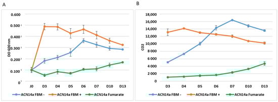 (A) Growth of Frankia alni strain ACN14a (DO 600 nm) in FBM medium with 5 mM propionate and 5 mM NH4Cl (yellow dots), in FBM medium with 5 mM propionate without NH4Cl (blue dots) and in FBM medium without propionate but with 5 mM fumarate and without NH4Cl (green dots) followed over a time course of 13 days; (B) CO2 in the gas phase over strain ACN14a (in the same conditions as in (A)). Bars are +/− standard error.
