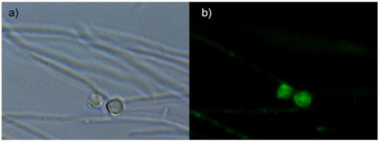 Free cells cultures of Frankia alni ACN14a grown for 7 days in BAP− medium observed under visible light and UV microscope. Phase contrast (a) and green filter DND-189 probe-treated (b). Strong fluorescence indicative of acidity is found inside N2-fixing Frankia vesicles.