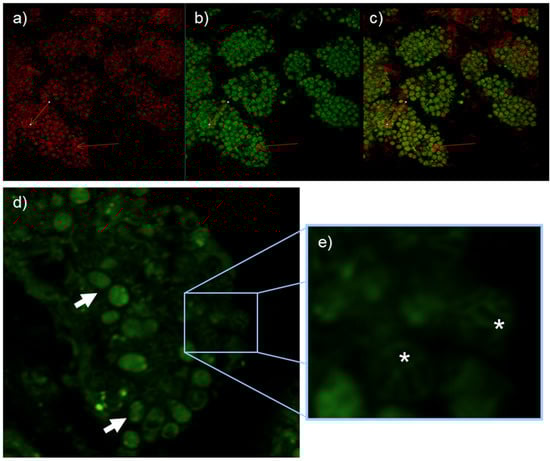 Alnus glutinosa nodules resulting from inoculation of Frankia alni ACN14a. Nodules treated with DND-99 and SYTO-9 under red filter (a) green filter (b) and overlay (c) show acidity inside vesicles. Nodules treated with DND-189 probe show absence of acidity in intervesicular spaces (arrows), (d) and in intermembrane spacers (*), (e).
