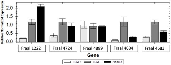 Relative expression of can1 (FRAAL1222), can2 (FRAAL4889), ctp (FRAAL4724), cpsA and cpsB (FRAAL4684 and FRAAL4683) genes in Frankia alni ACN14a grown under nitrogen-free conditions in FBM− (grey) media, with 5 mM ammonium in FBM+ media (light grey) and in symbiosis within Alnus glutinosa nodules (dark).