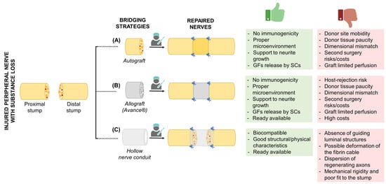 Bridging strategies for the repair of injured peripheral nerves with substance loss. For each strategy, including (A) autograft, (B) allograft (Avance®), and (C) hollow conduit positioning, the figure reports the specific advantages (green box) and limitations (red box). GF, growth factors; SCs, Schwann cells. The Figure was partly created with BioRender.com (accessed on 17 May 2023).
